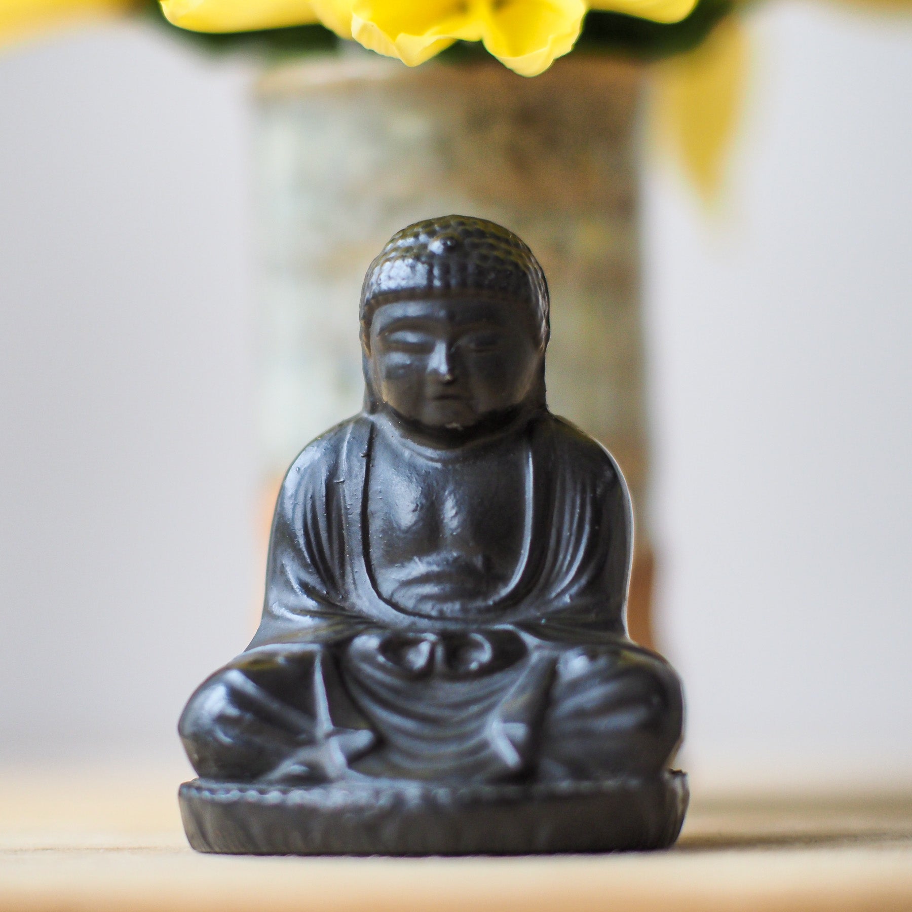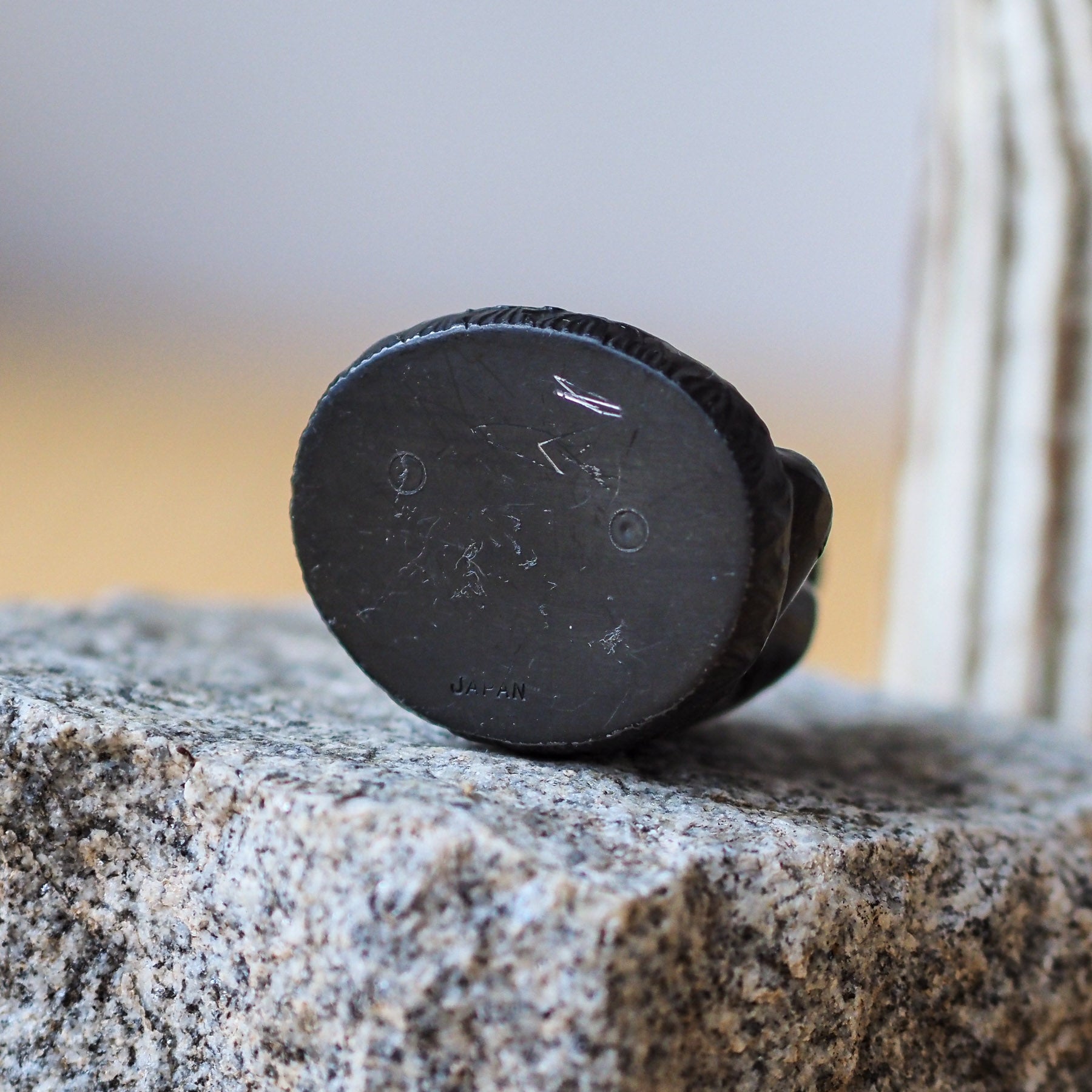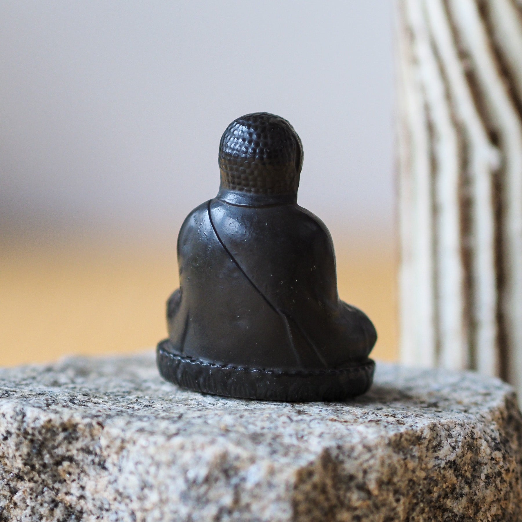 A diminutive vintage Buddha statuette, crafted in Japan, graces your tea table. This petite metallic piece, cloaked in a sleek black finish, carries with it the marks of age and wisdom. Please note a minor scratch on the base, along with slight blemishes on the chin and the tip of the nose, as they attest to its journey through time.