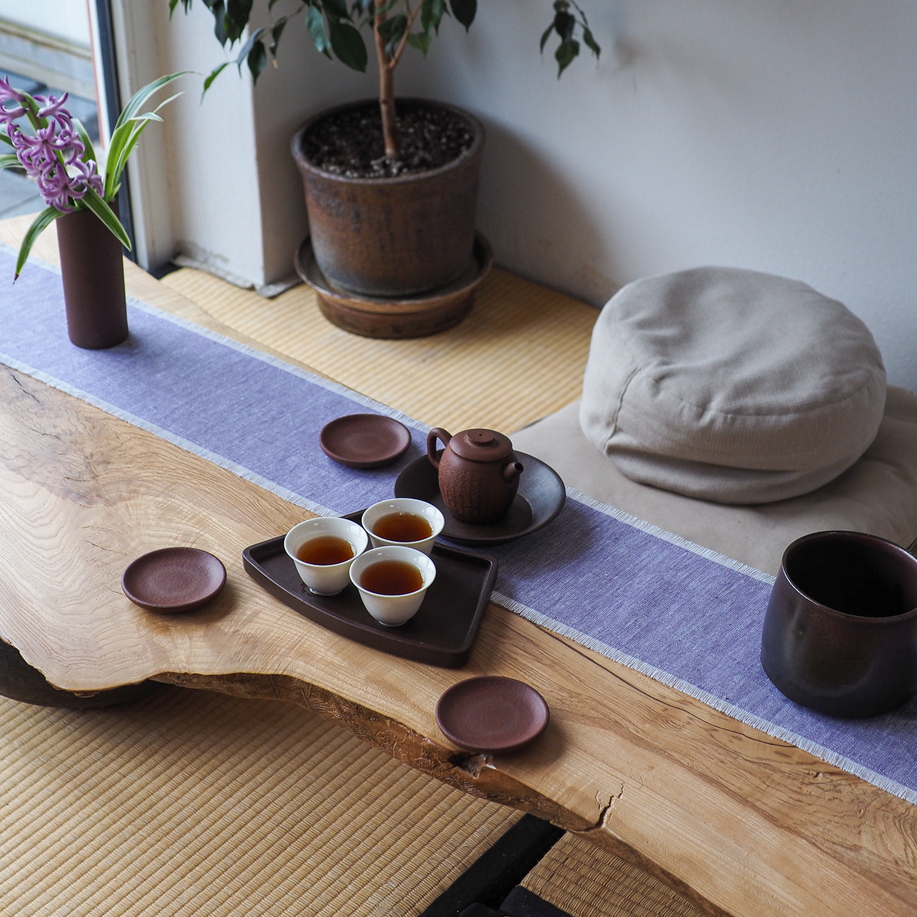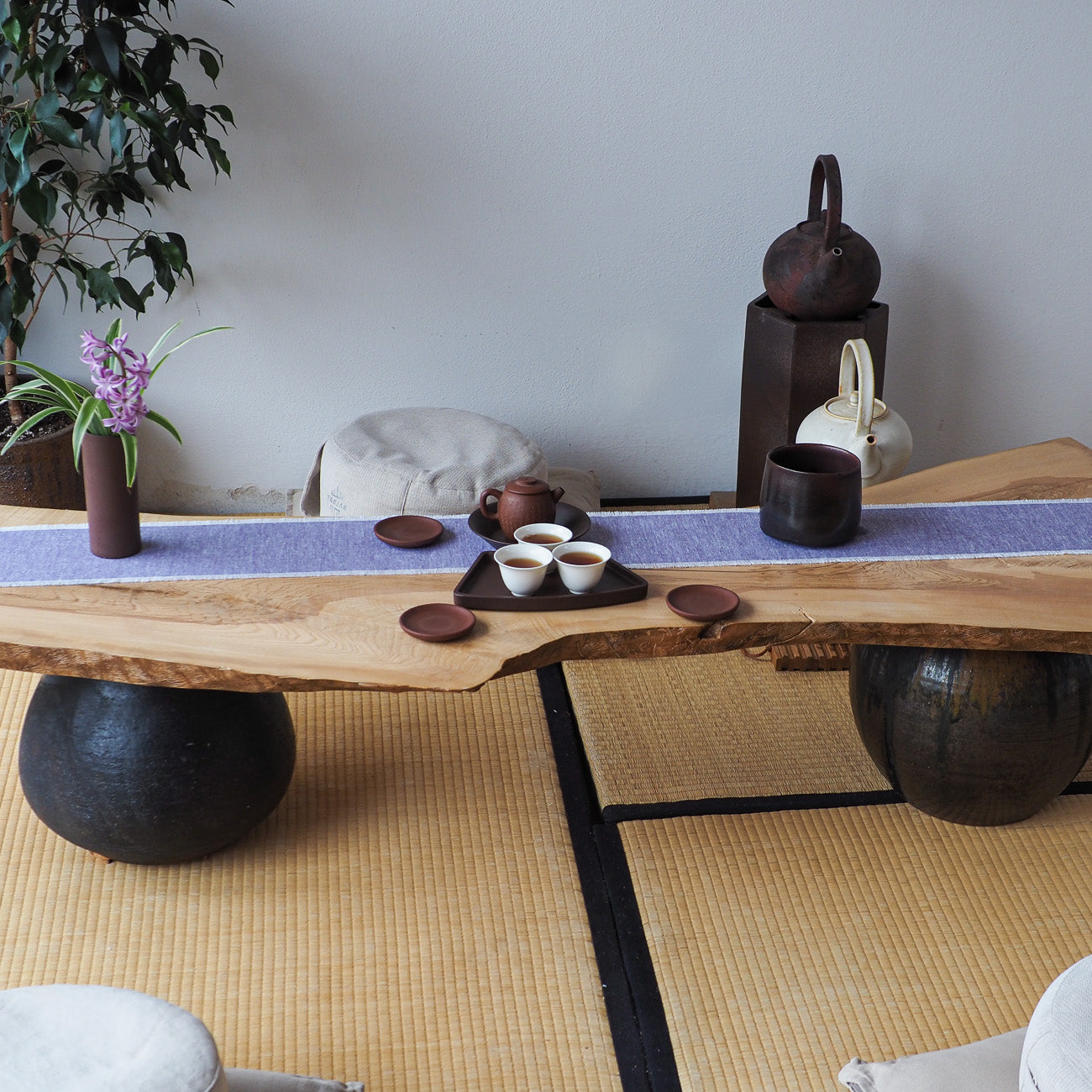 Woven from pure linen, this runner combines elegance with everyday functionality. Its crisp white and purples — create a ribbon of color that naturally draws your eye, guiding attention to the tea stage. Whether it’s framing your favorite teapot or highlighting a set of bowls, this design becomes an intentional part of your tea space.
