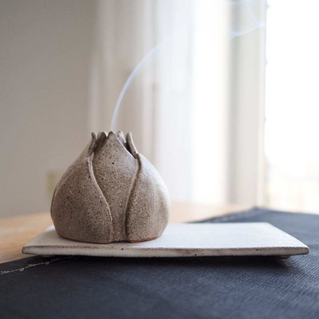 This ceramic incense holder is hand-crafted to bring joy to your eyes as well as your nose. The set includes a tray, a lotus bud, and a simple stone designed specifically for holding incense sticks.