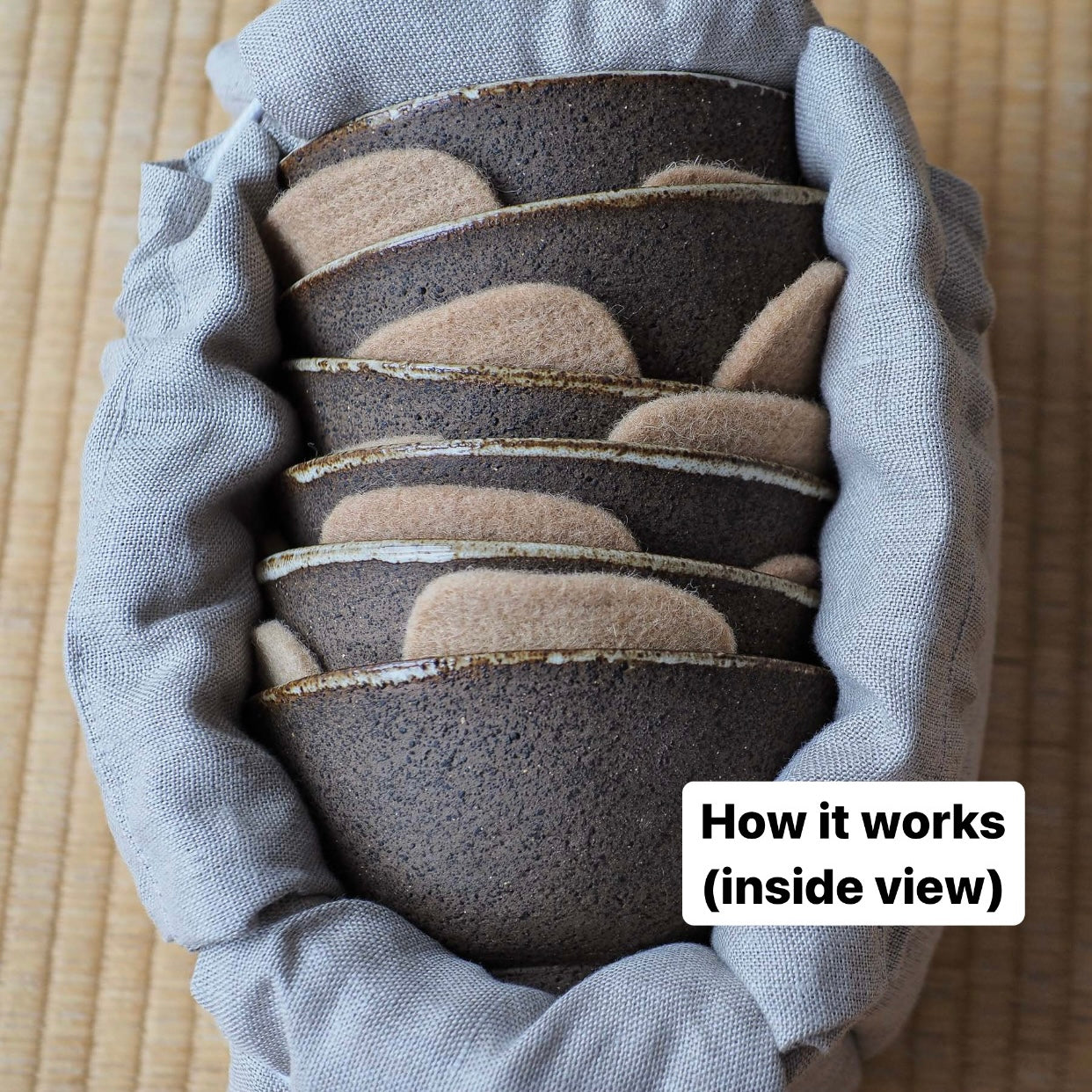 This bag was originally designed for side-handle teapots, but over time, it’s proven to be versatile and convenient for all sorts of uses.This bag can accommodate 5 or a maximum of 6 bowls, depending on their size and width. While this bag demands more attention and care during packing, carrying, and unpacking, it offers a space-efficient alternative to the more protective Travel Bag
