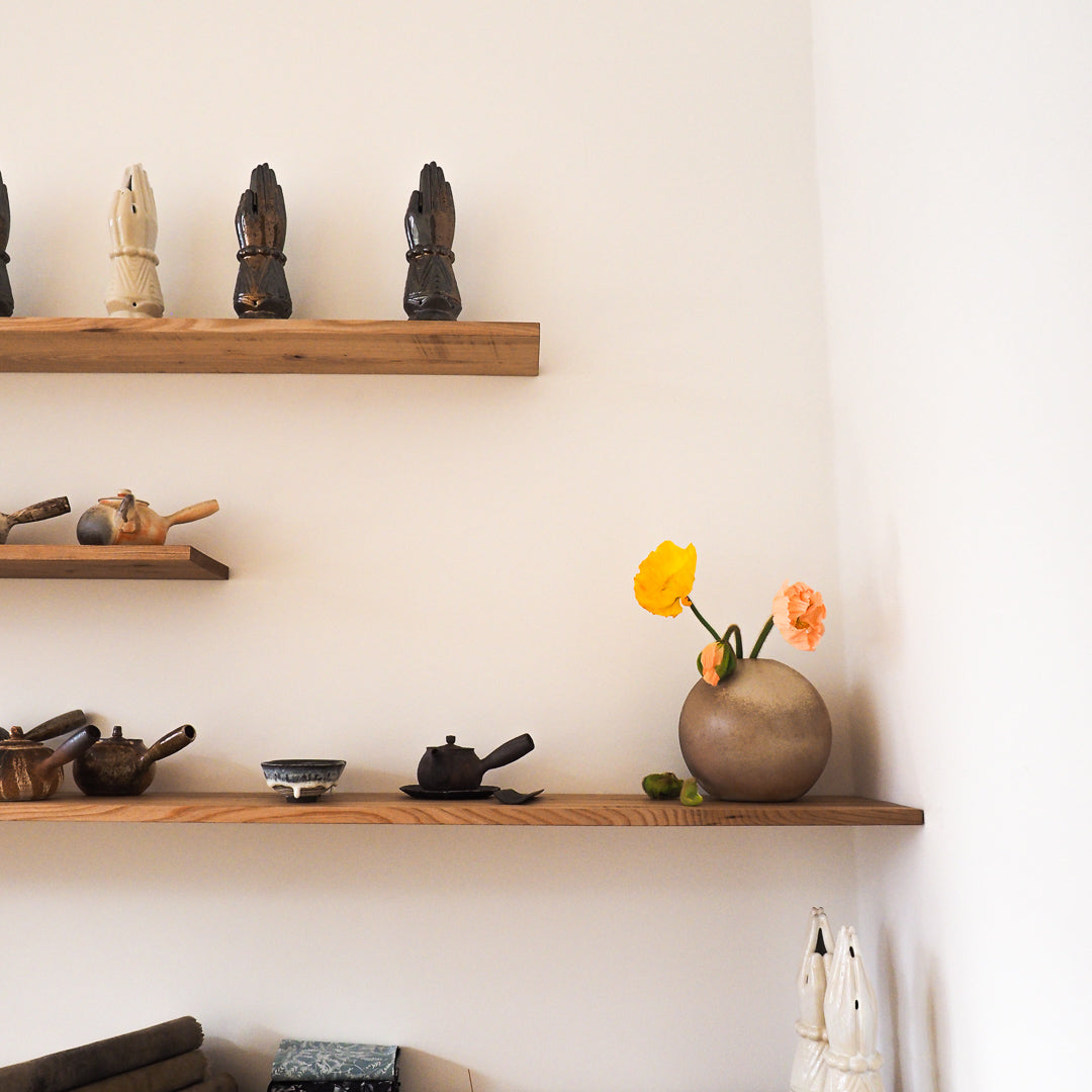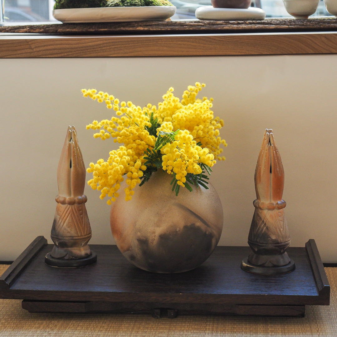 Woodfired sphere vase was made from stoneware clay and fired over 1330°C. It is glazed inside to make it easier to maintain the flowers. Unglazed outside, covered with ash from wood firing, created stunning pattern of mountain in a fog.