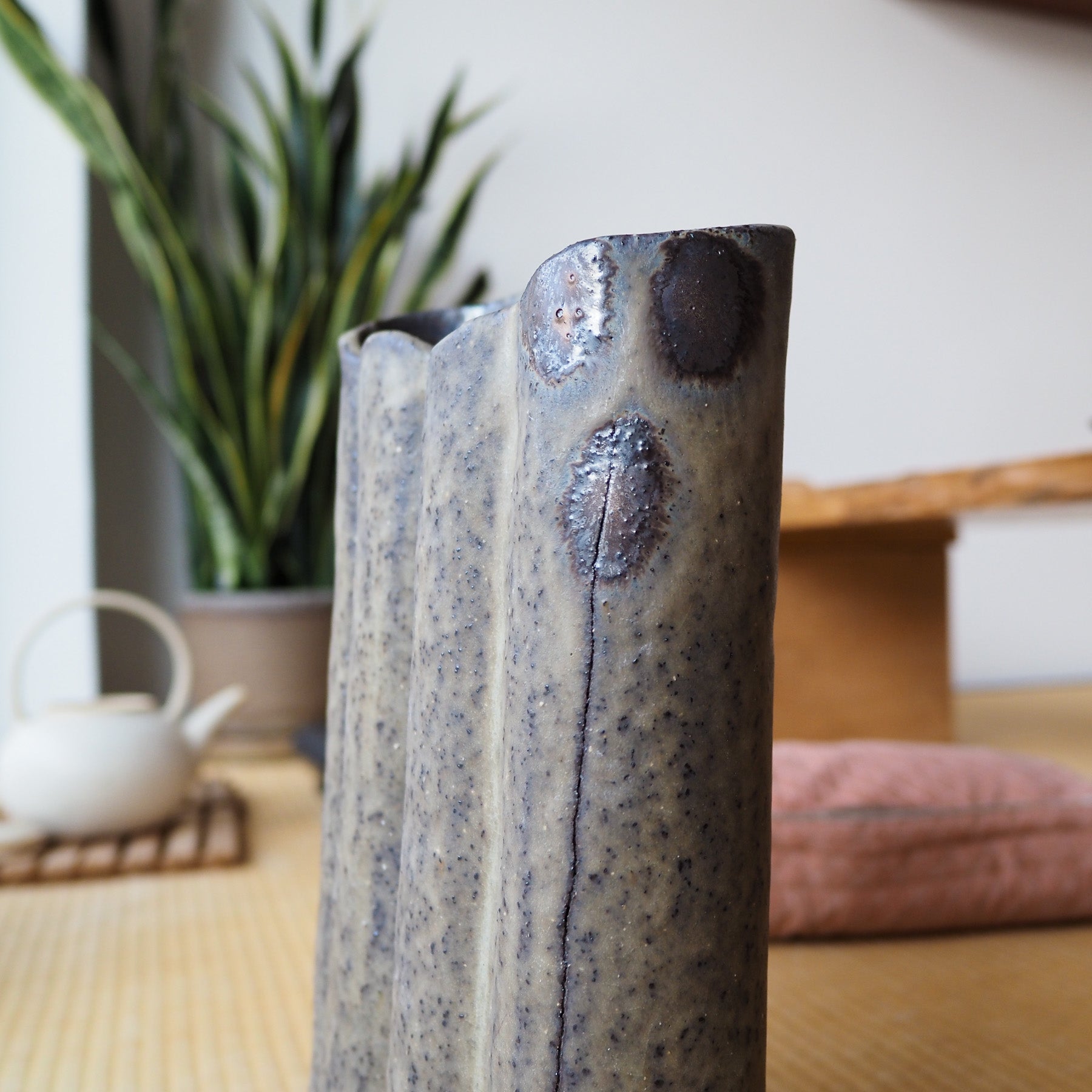 A natural crack runs along its side, a mark of imperfection that does not diminish its beauty but deepens it. Its not a flaw but as part of its story. In the spirit of wabi-sabi, it speaks of resilience: though marked, the vase remains whole, holding water and life with ease.
