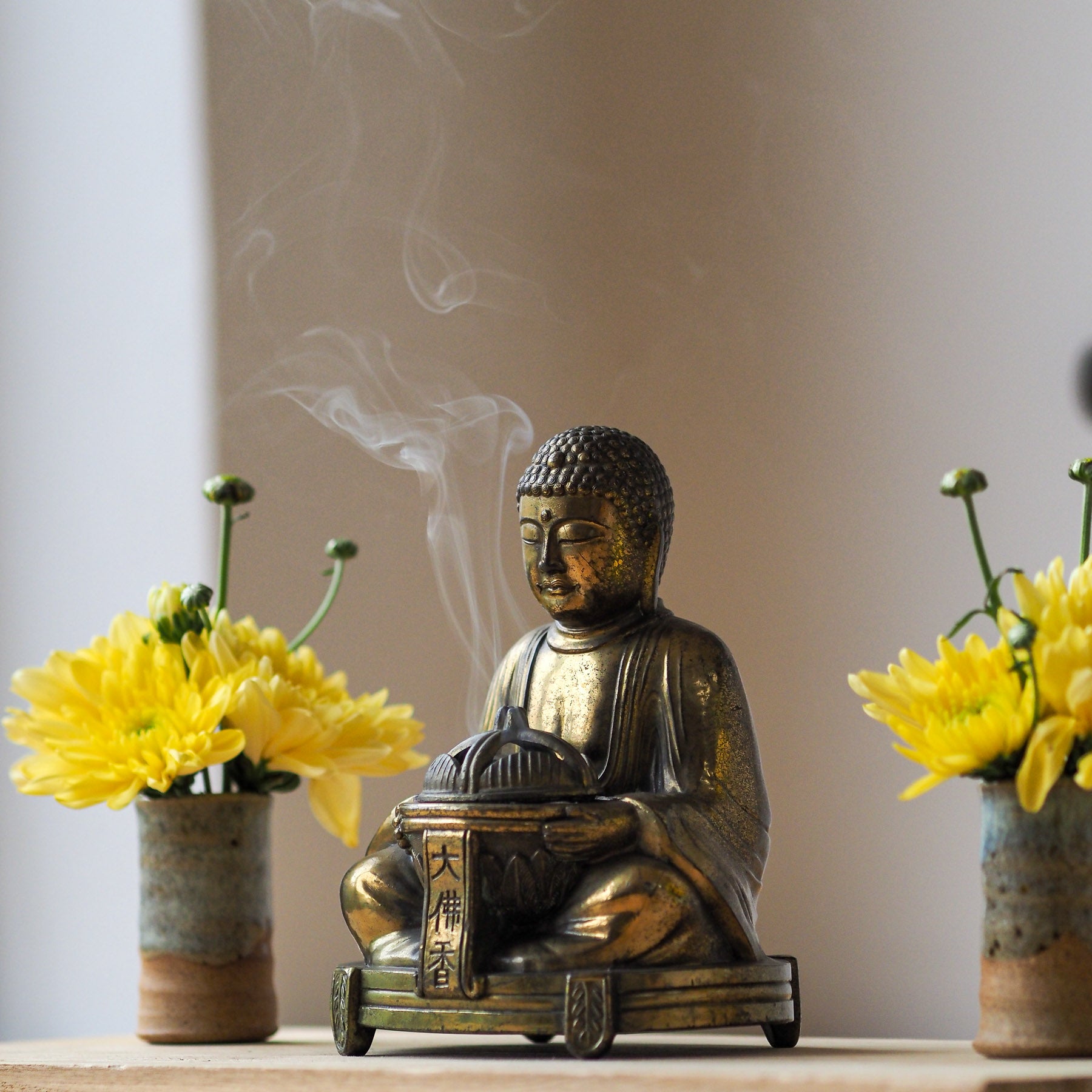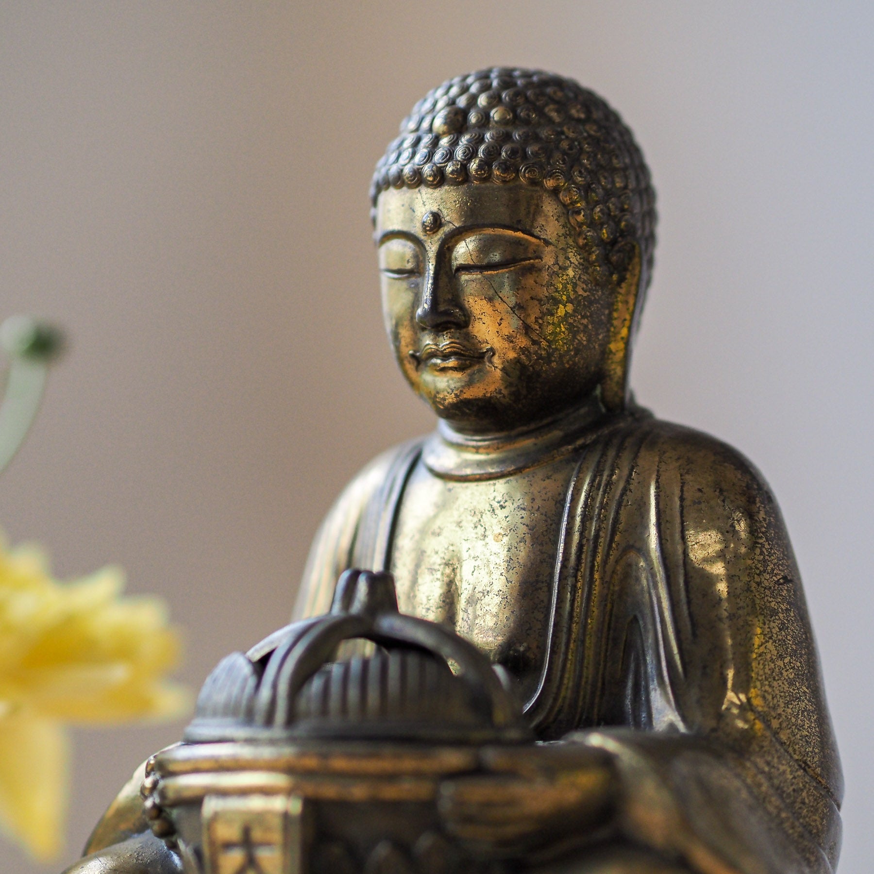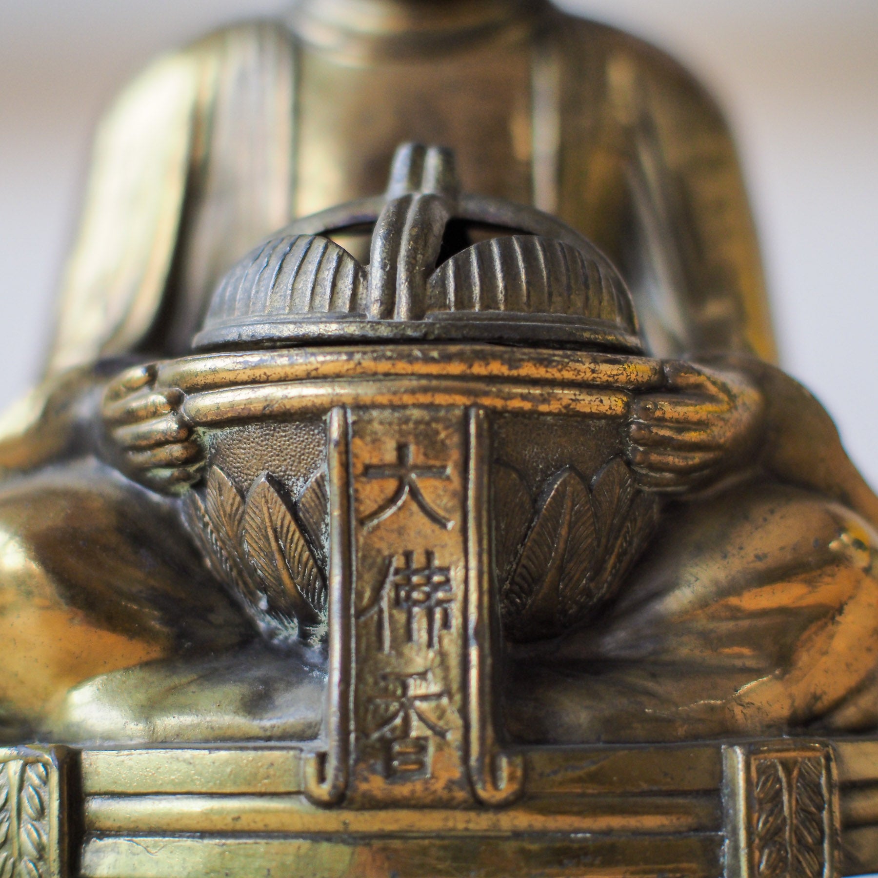 An antique Japanese Buddha figurine, gracefully adorned with the subtle patina of time. Buddha cradles an incense bowl, thus might serve as an altar statue and an incense burner, enabling spiritual contemplation. Reverently designed in a meditative seated posture, the statue has a gentle and compassionate countenance.
