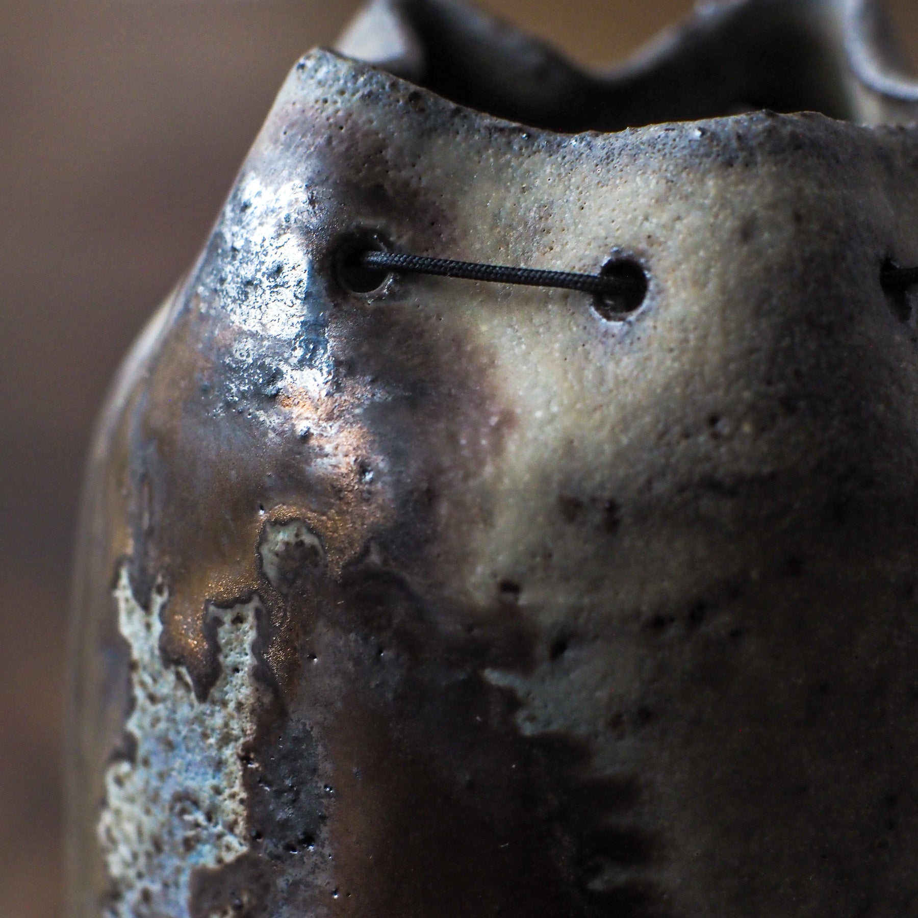 Vase made for chabana — the natural, simple and elegant flower arrangements used in the tea ceremony. Threaded through the body are hand-cut openings, laced with black cord and finished with small brass charms in an endless-knot motif — a traditional symbol of continuity and interconnection.