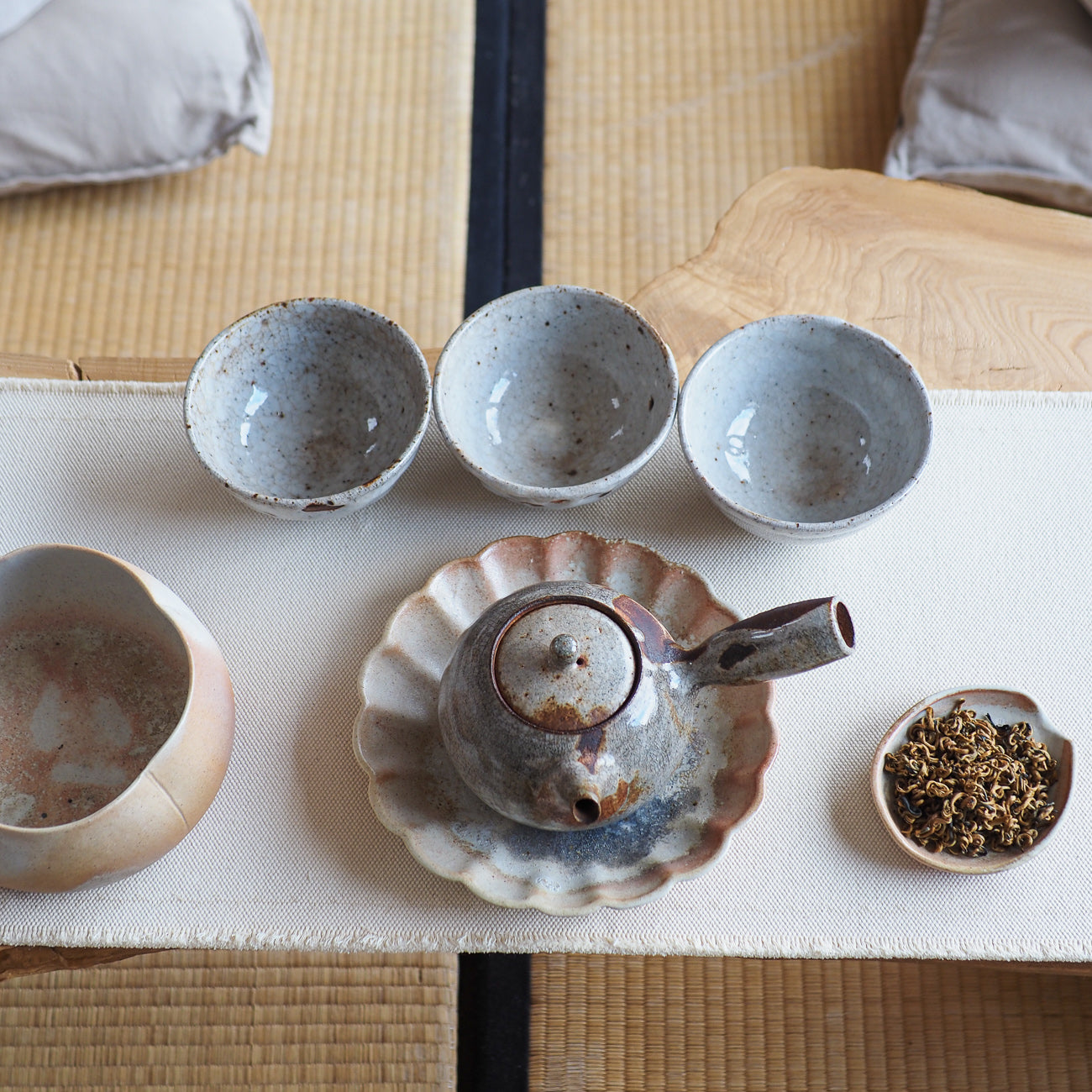 This one-of-a-kind set includes three pieces: a flower-shaped teapot holder, a flower-shaped jian shui, and a petal-shaped scoop. Each piece is both functional and visually striking, adding a natural elegance to the tea table. Their forms echo the early spring bloom — a season of renewal and quiet joy.
