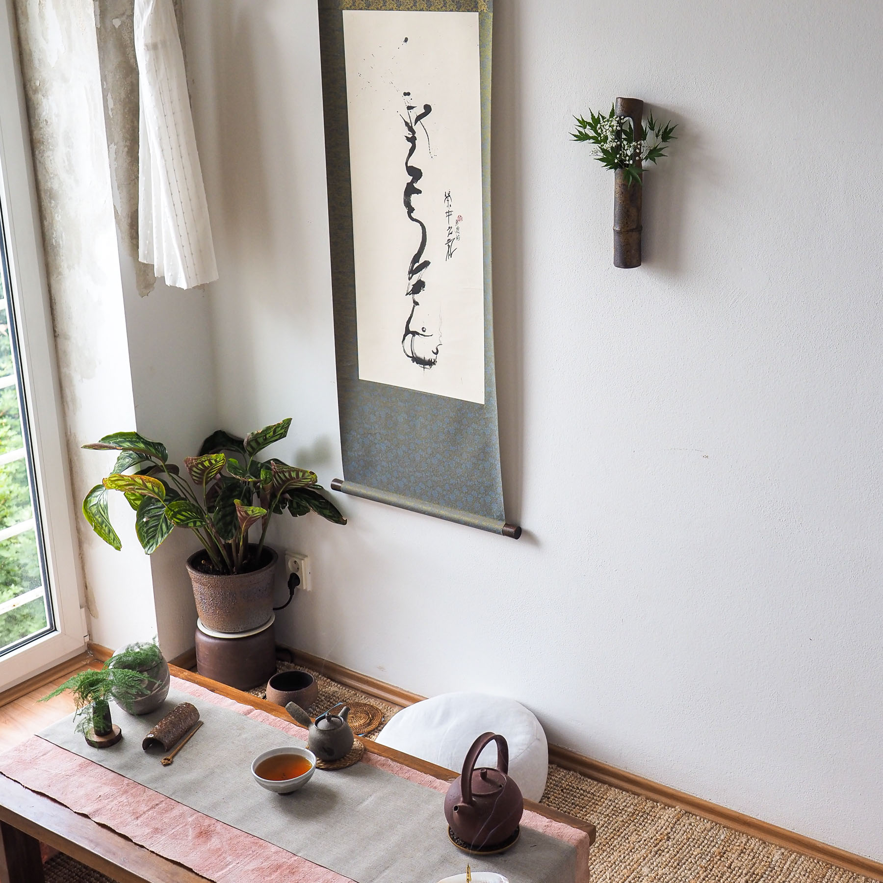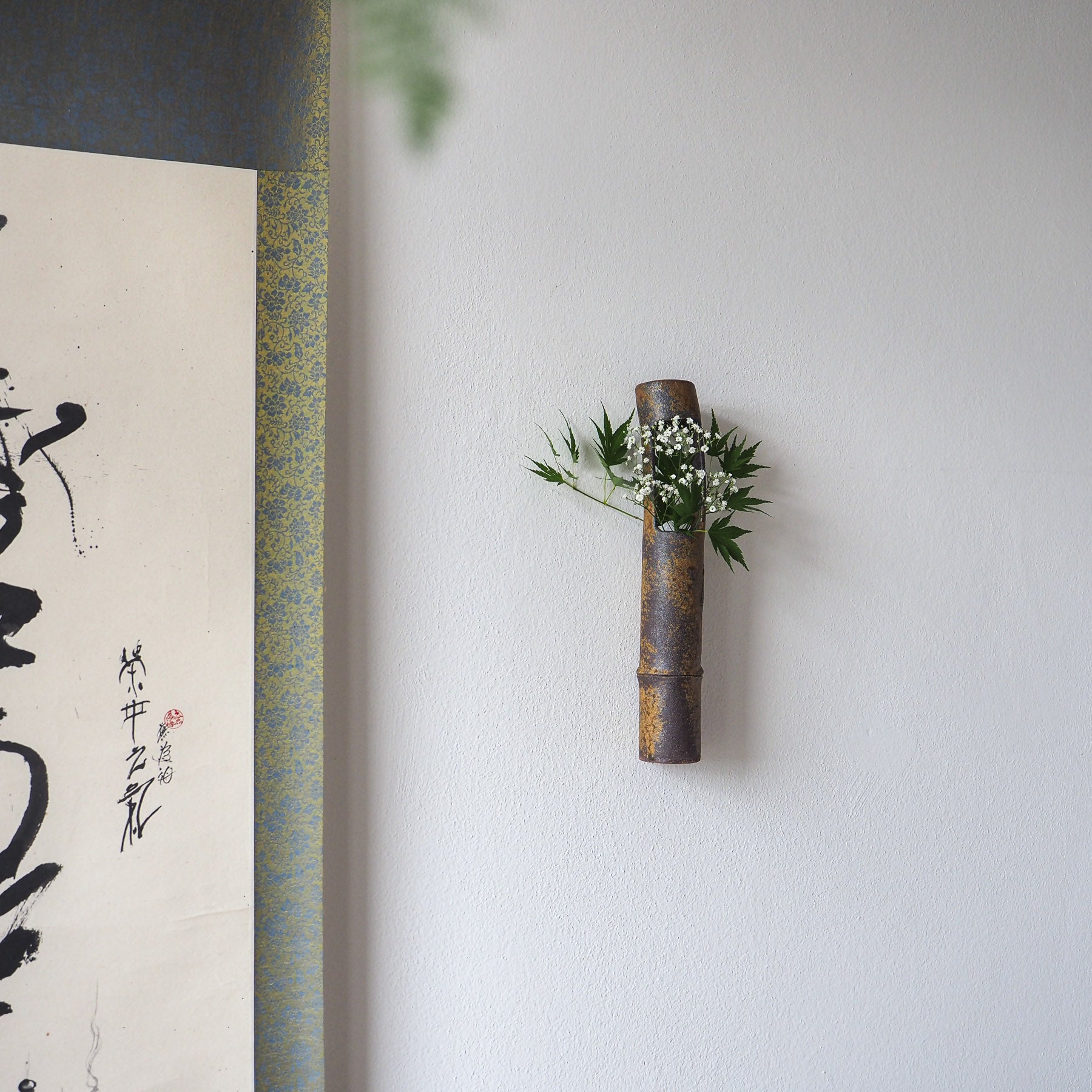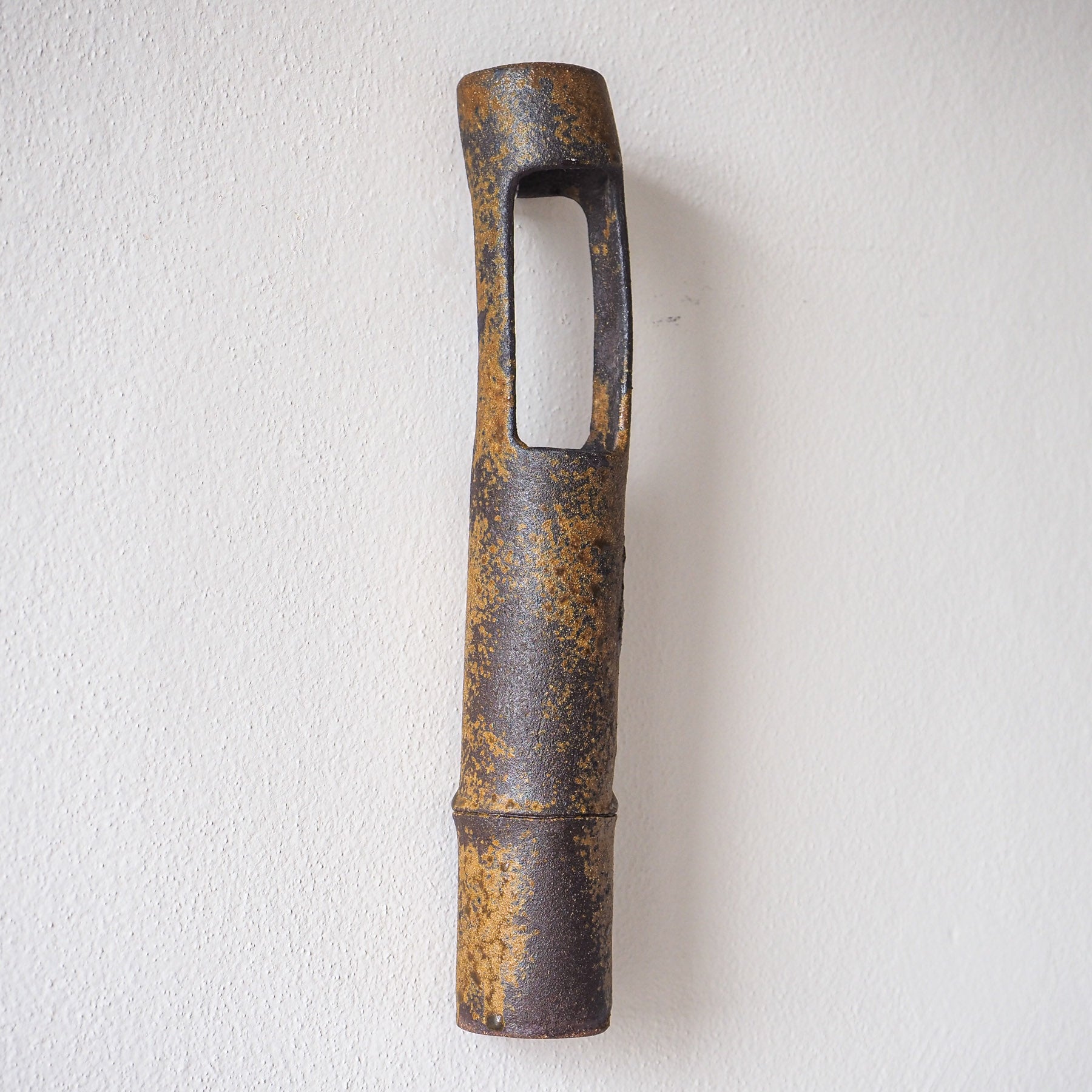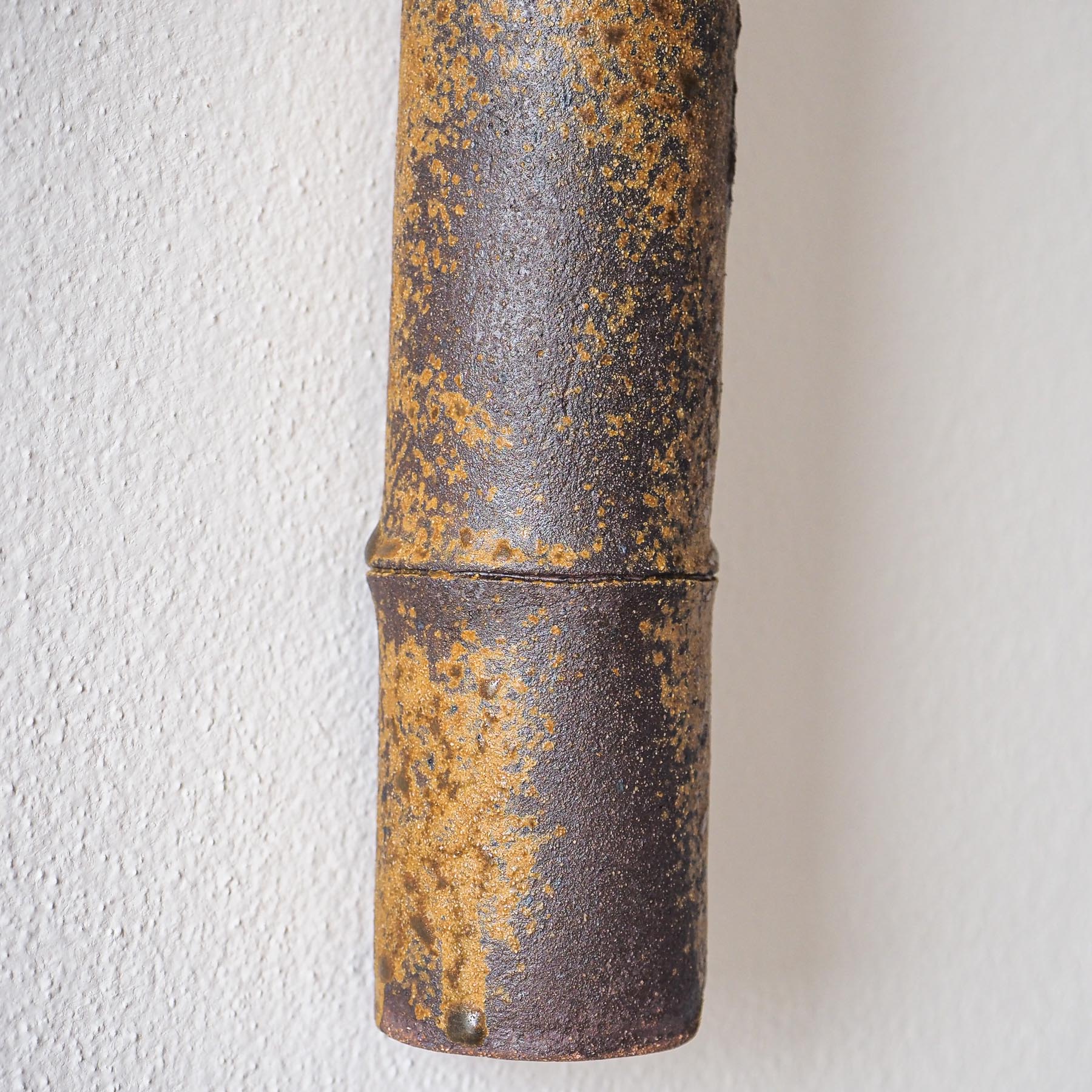 Gorgeous woodfired ceramic wall vase. A wabi addition to any tea room wall. Perfect for elegant branches, live flowers, or dry flowers. Serve as wall decor or stand on a tea table or in a tokonoma niche.