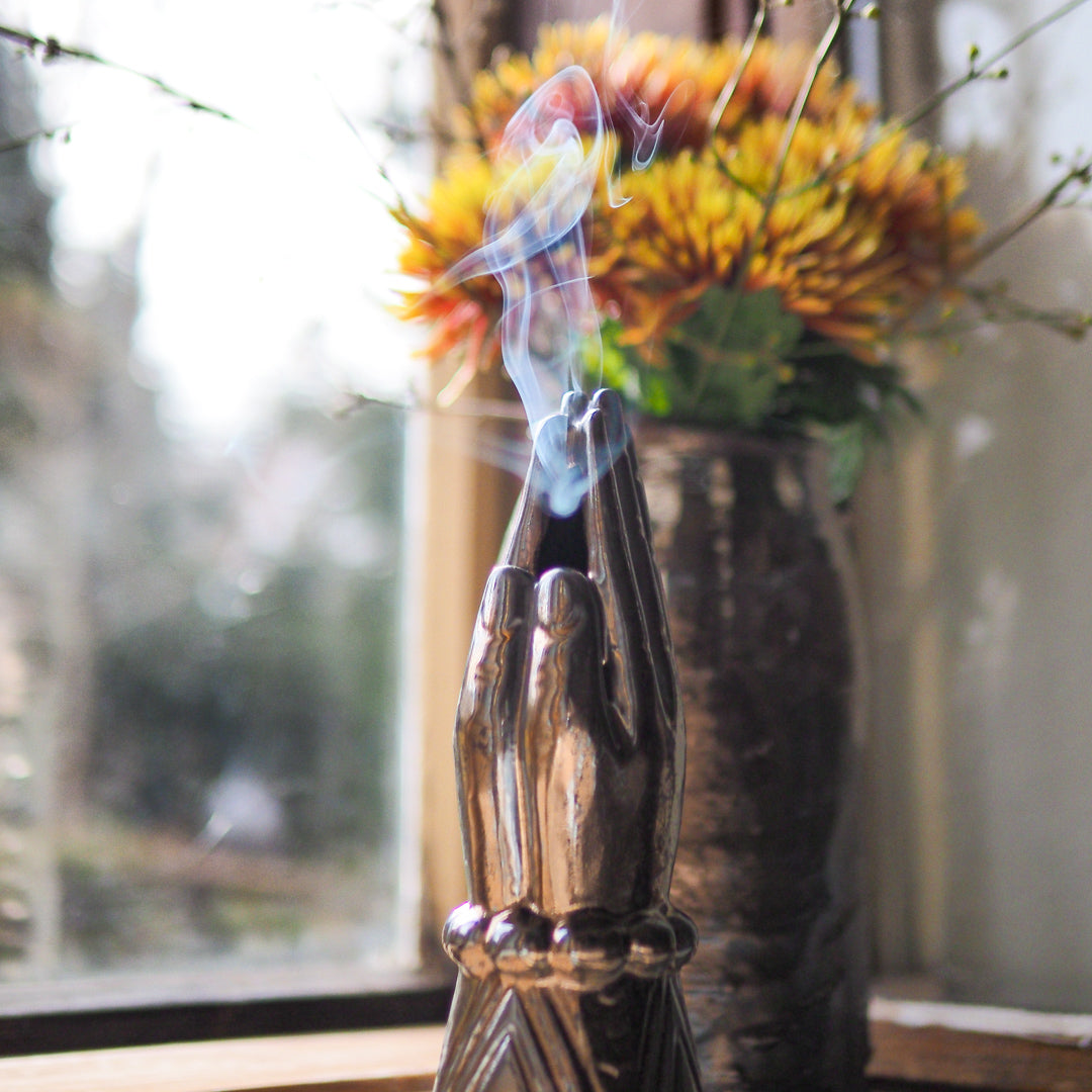 To use the incense holder, simply place your lit incense on the base plate standing and cover it with the hands. Smoke will flow through the fingers. As the incense burns, it is normal for the inside of the holder to become discolored due to the smoke.
