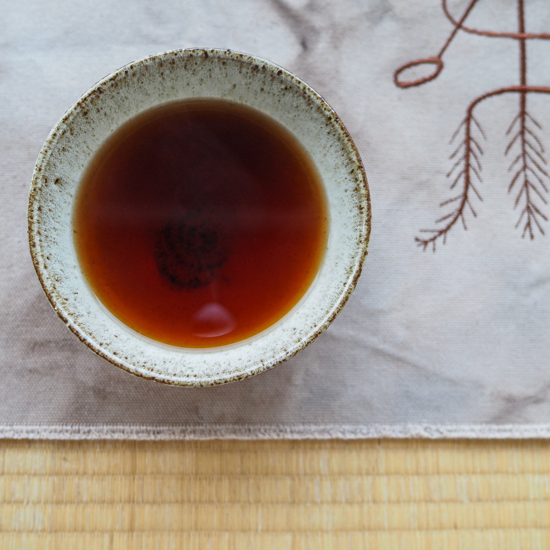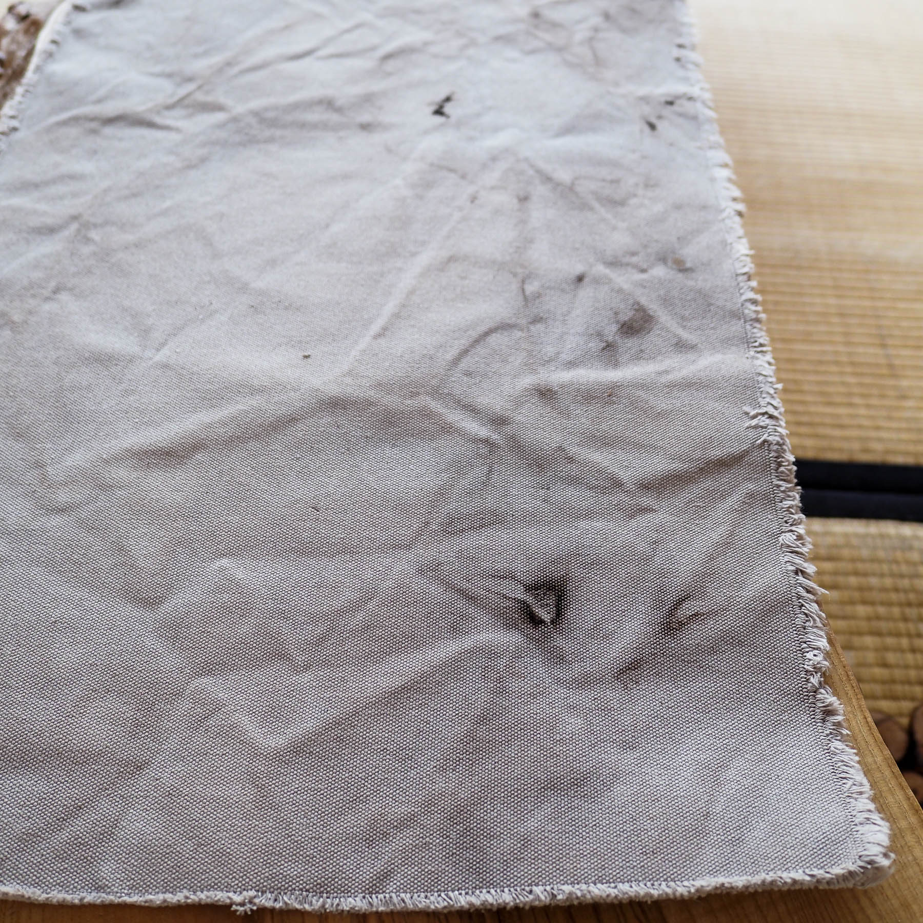This chabu is hand-dyed using shou puerh tea, resulting in a deep, saturated marks with subtle variations and contrasting spots that add character and intrigue to each piece. Due to the handmade nature of the process, every chabu in this collection is distinctive. Although they were dyed in the same batch, each piece carries its own individuality and captures the essence of the tea-dyeing process.