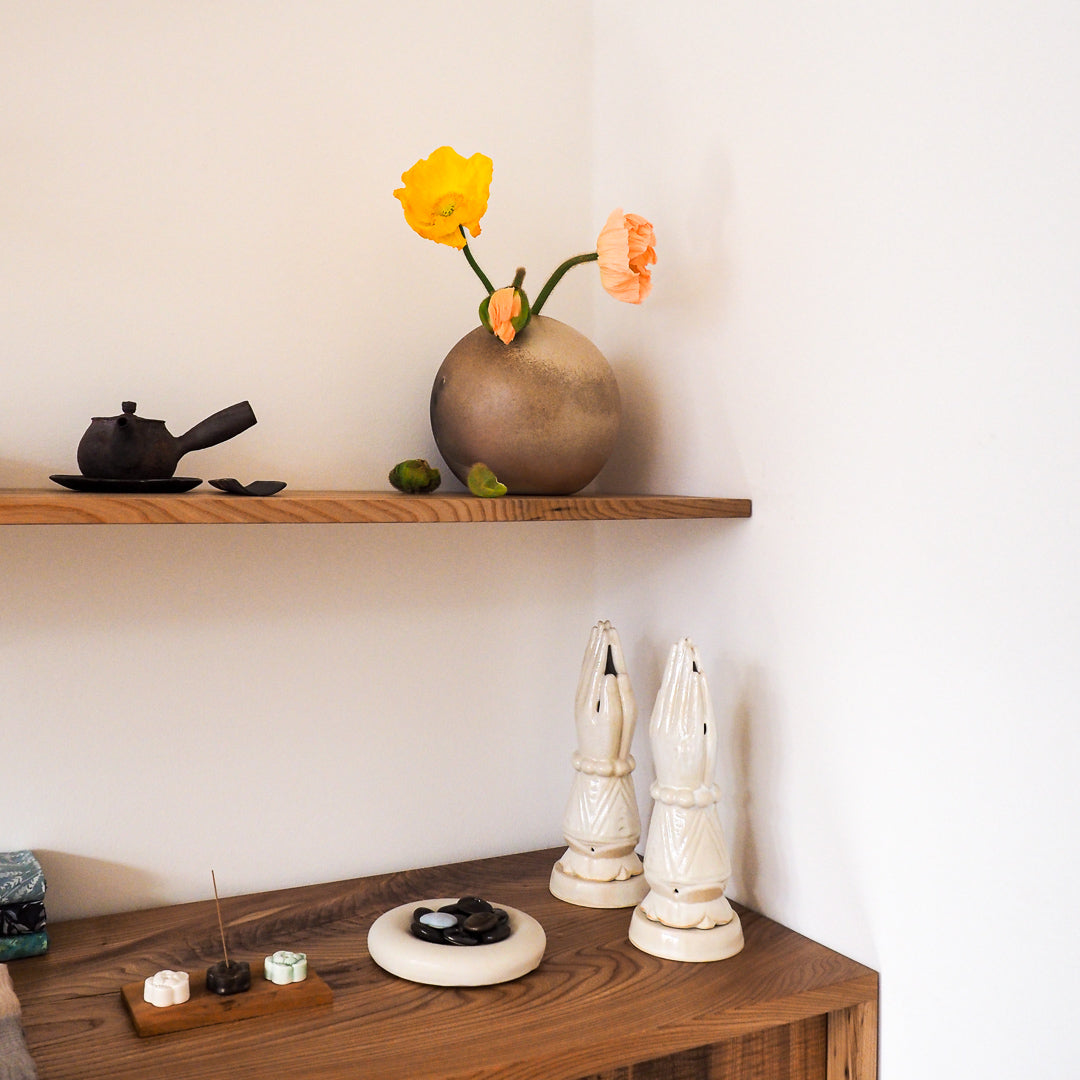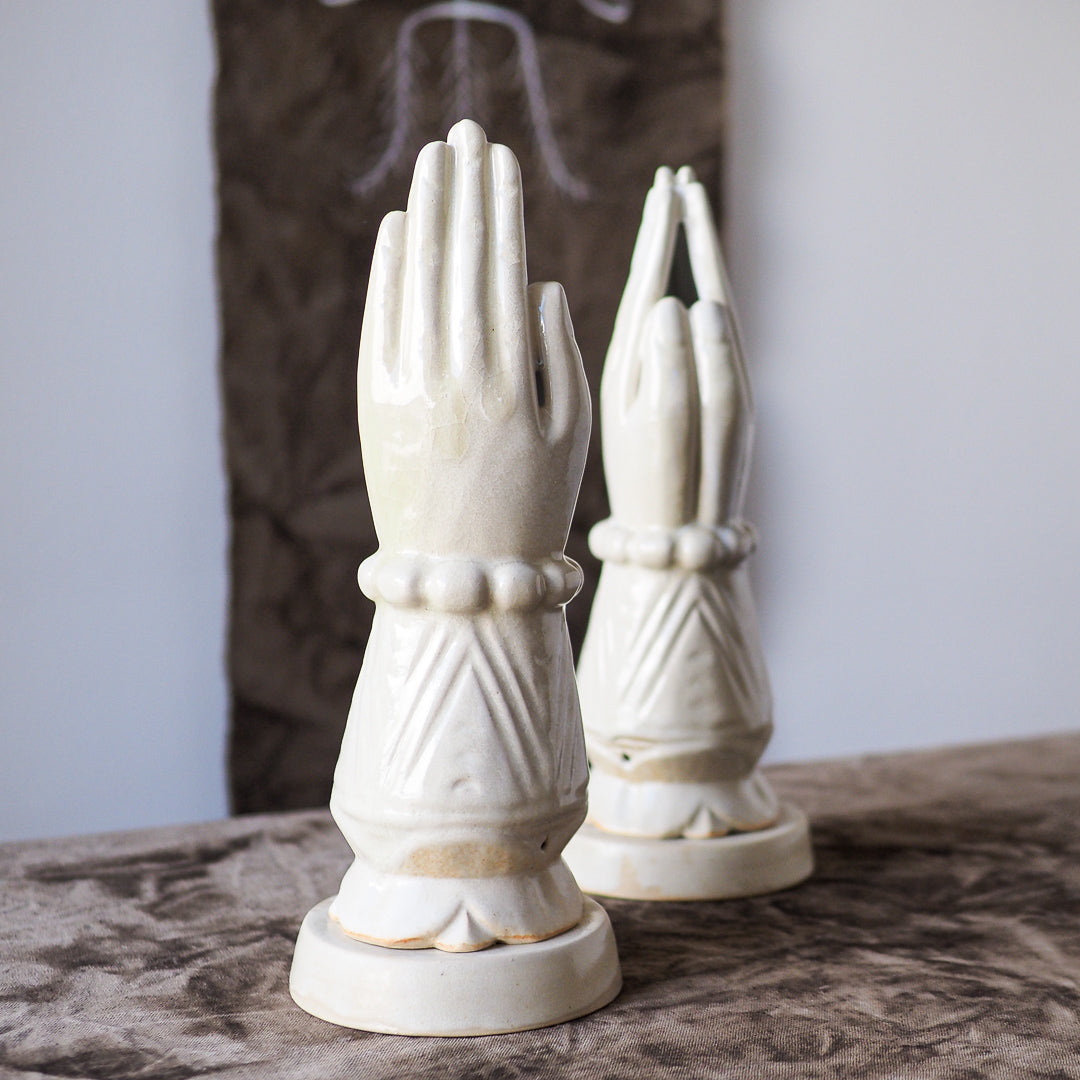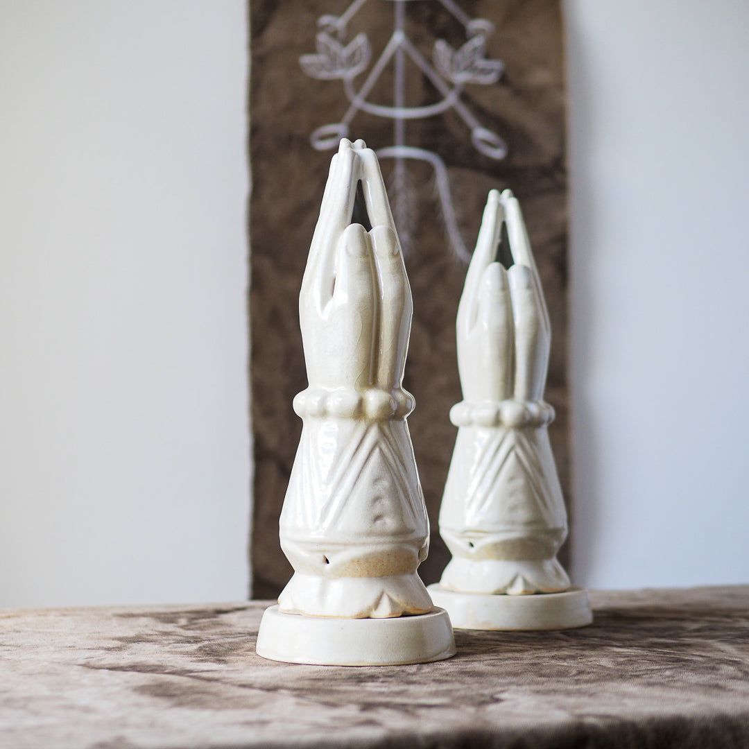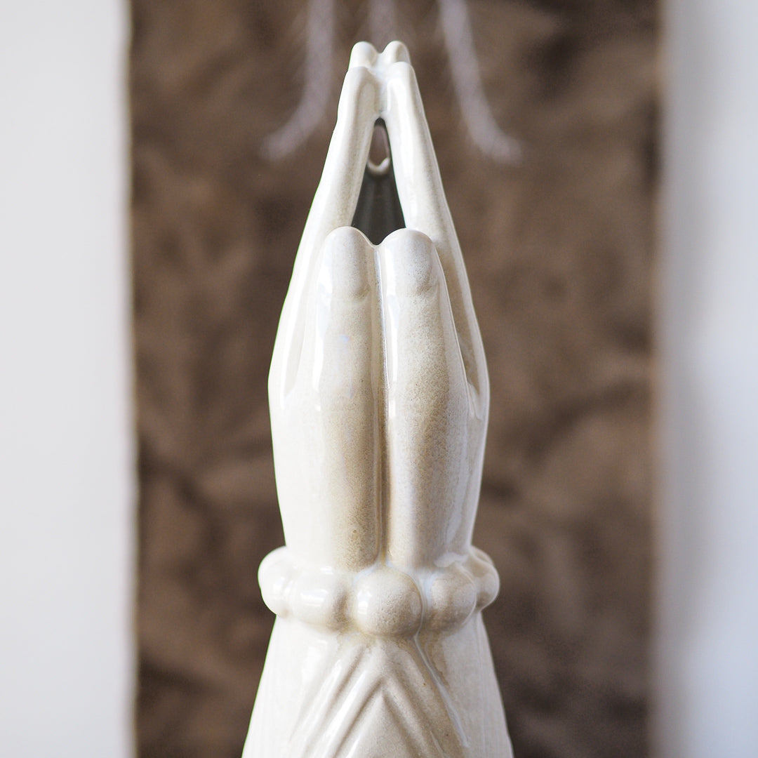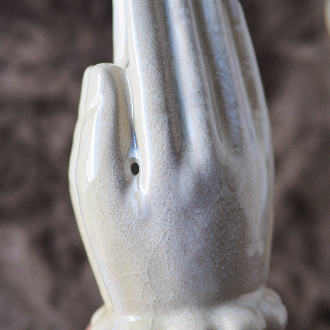 This ceramic incense holder is hand-crafted to bring joy to your eyes as well as your nose. The set includes a hands and a stand with a small ash bowl.