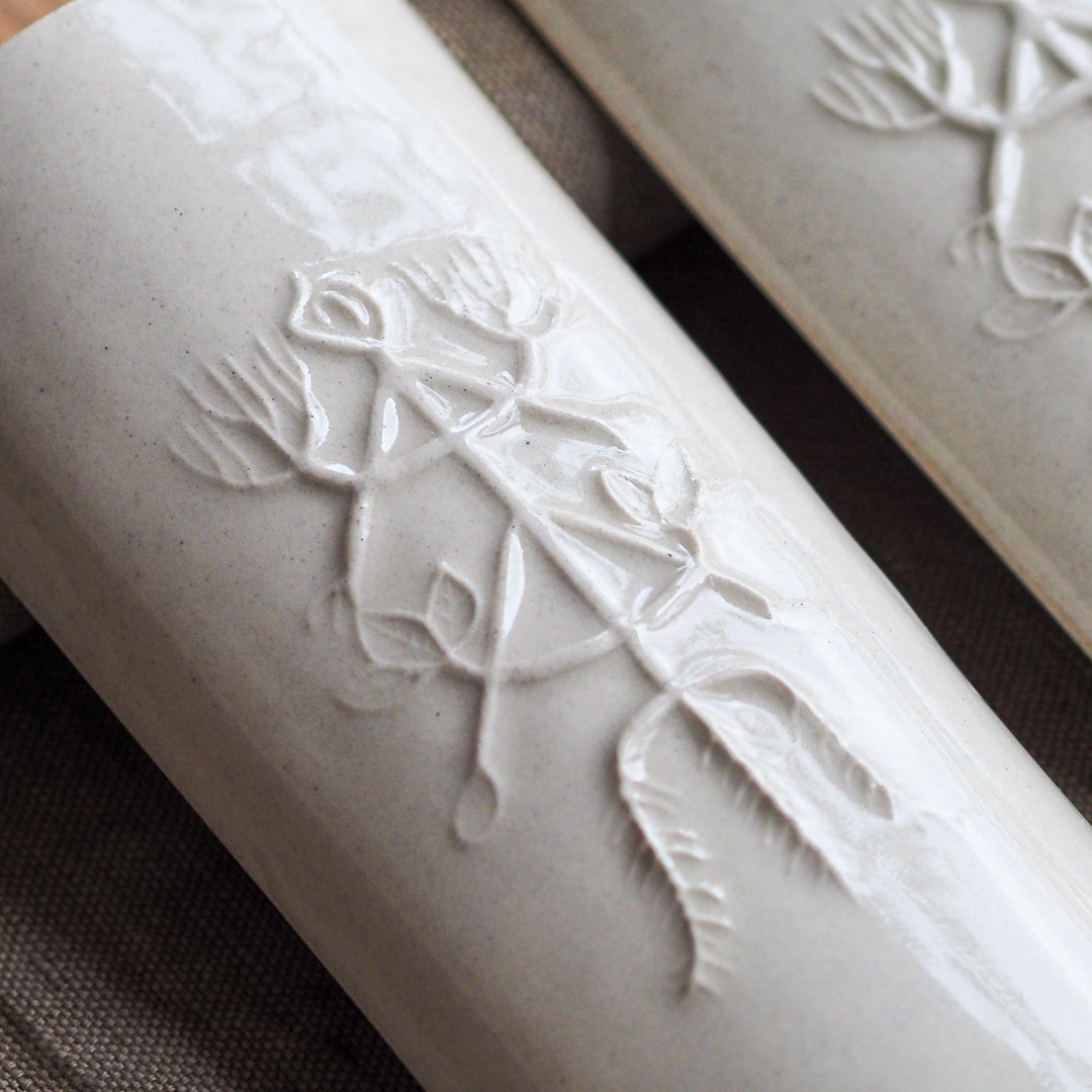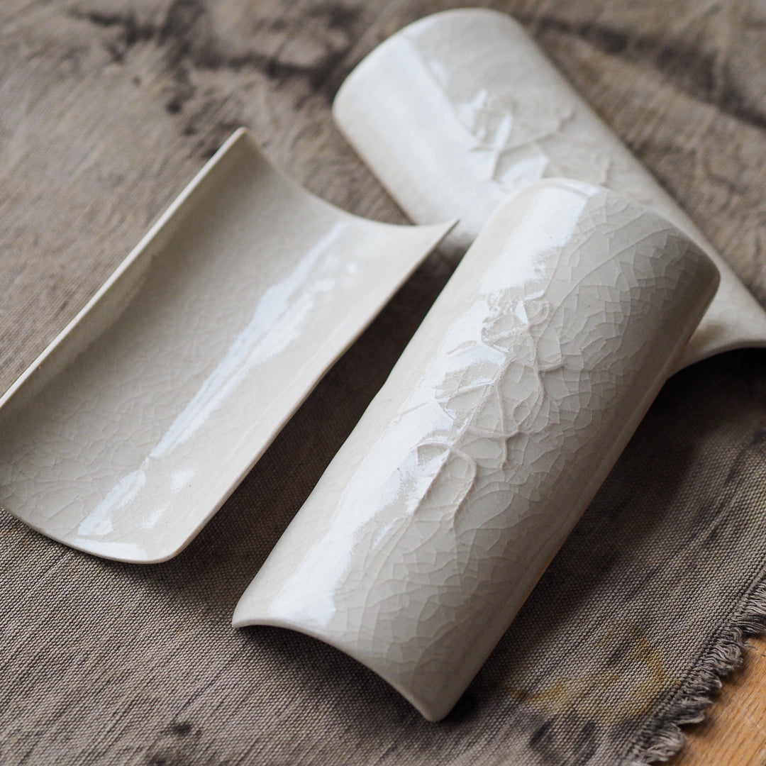 The scoop is covered with a smooth white glaze inside and outside, providing a pleasant texture to the touch. Quite large, for big group sessions. There are two glaze options available: one with crackles and the other with a clean, pure transparent glaze.