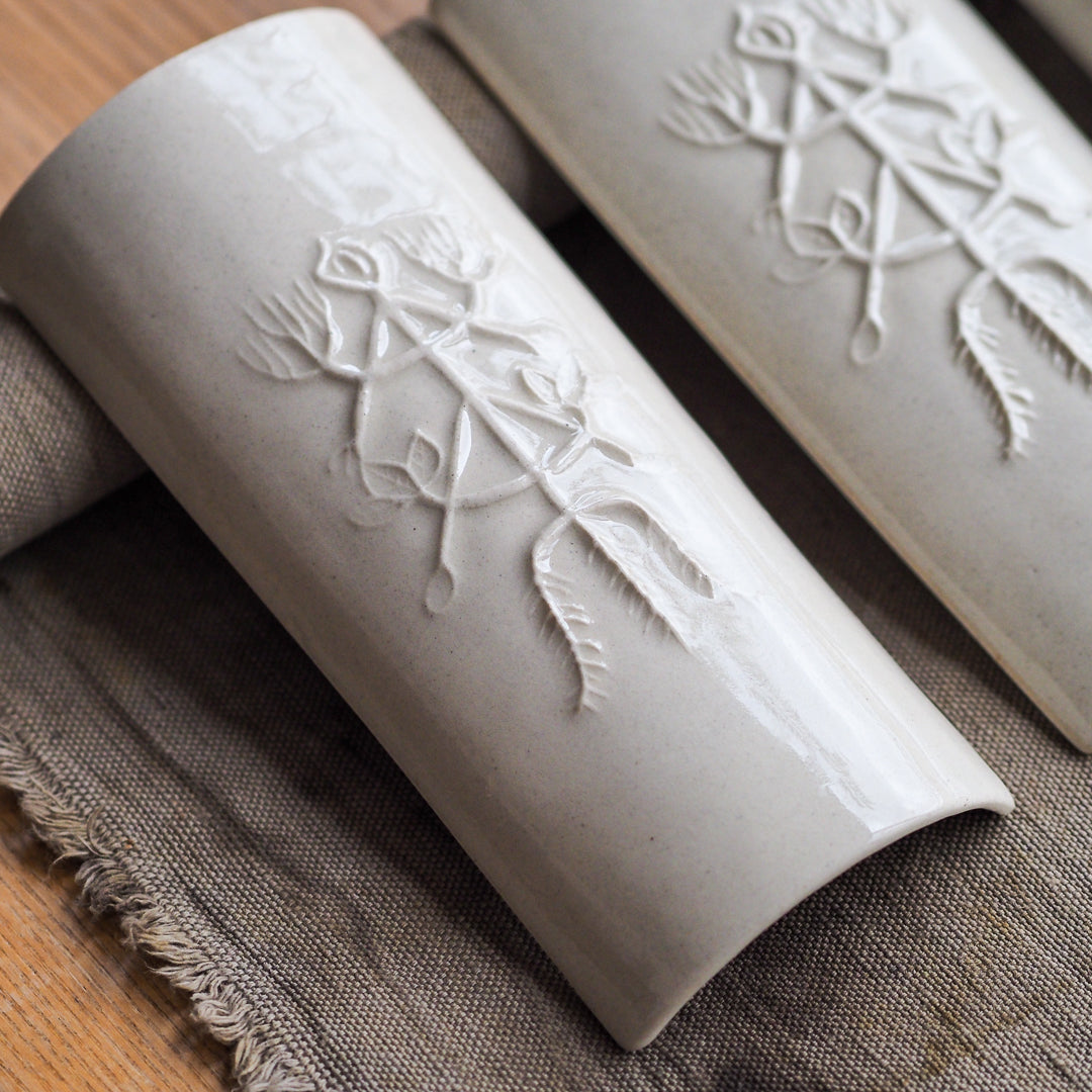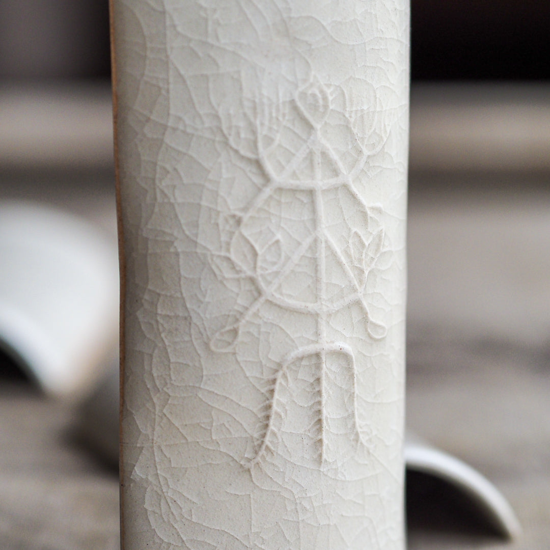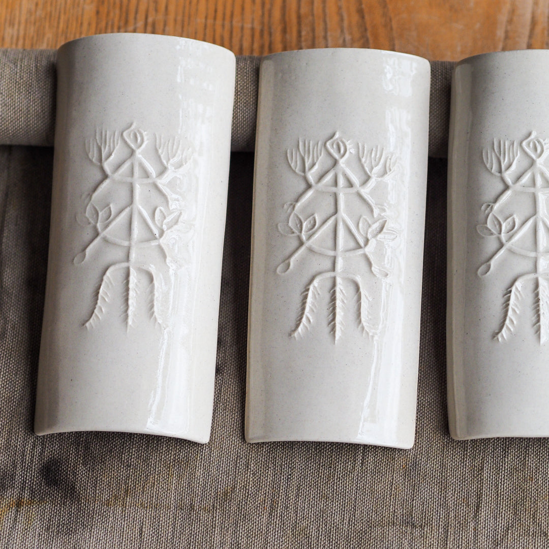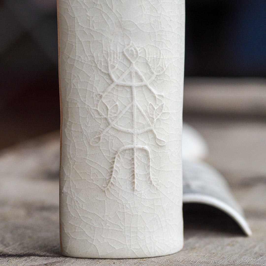 Handmade ceramic scoop featuring a representation of the most well-known symbol among tea people - the Chinese character for tea 茶. Presented in an artistic manner, it is based on a painting by Taiwanese tea teacher Huang Chuan Fang. This depiction captures the essence of humanity in tune with Nature. The “person,” shown as male and female both, isn’t just climbing the tree to pick leaves, he/she is living within the tree itself.