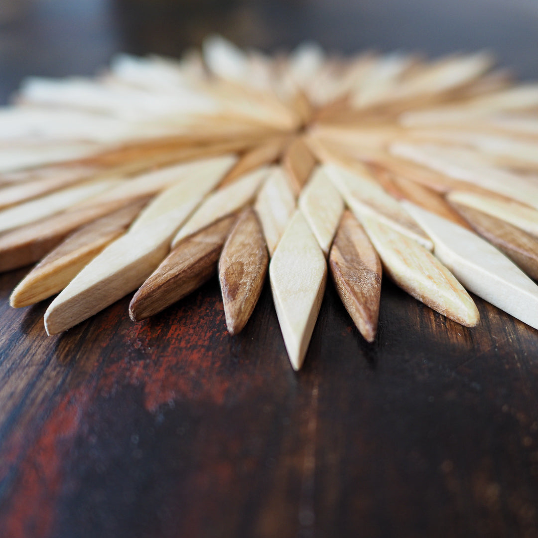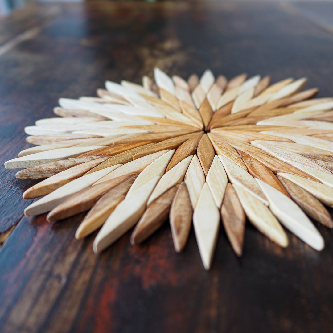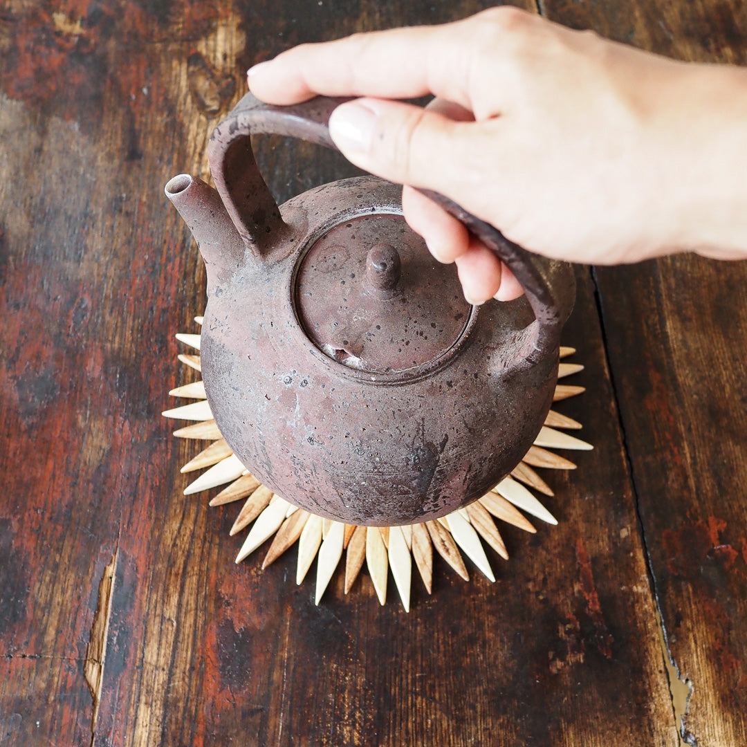 The quest for the perfect wooden stand took a while, but we've found a gem. Crafted from cedar, walnut and apple tree wood, these trivets are not glued but woven, ensuring their sturdiness. Each piece boasts distinct shades and varying wood color intensities, making it a beautiful and practical addition to your tea setup.