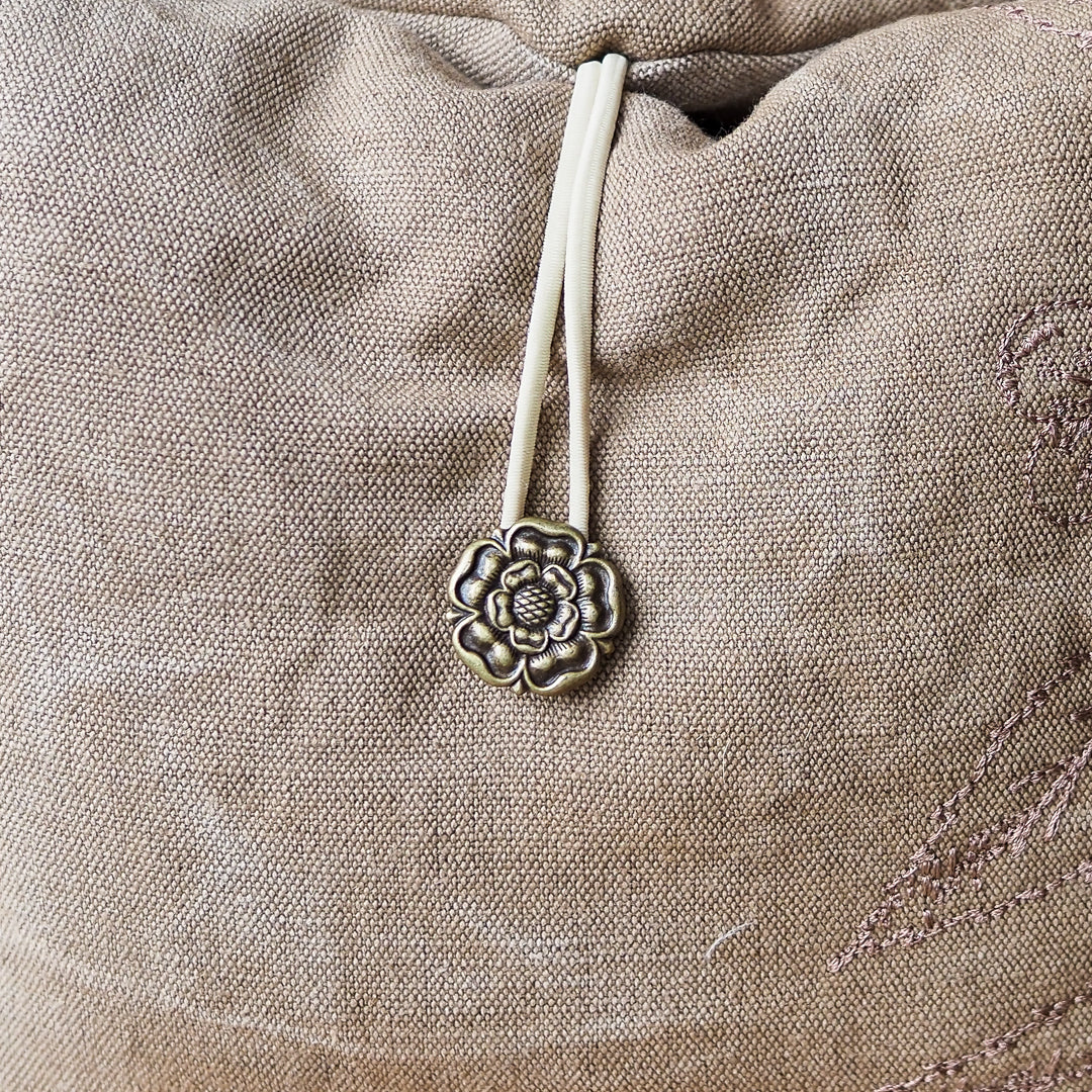 In addition to the tea-dyed fabric, our limited edition travel bag also features an embroidery of Camellia sinensis, the tea plant, along with delicate tea leaves and flowers on the right side of the bag. This embroidery adds a touch of elegance to the bag, showcasing the beauty of the tea plant, which is the source of the medicine we all enjoy.