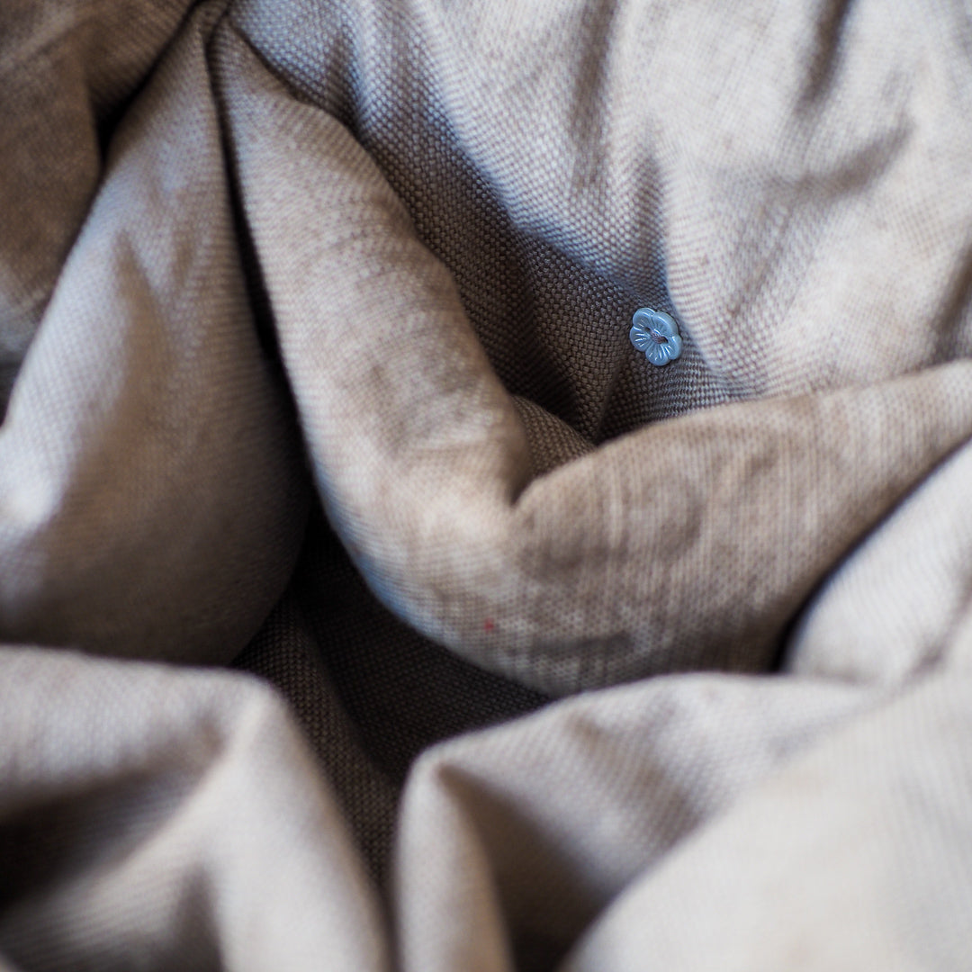 As an additional detail, Tea-dyed travel bag also features buttons in the shape of a tea flower, both inside and outside of the bag. These tea flower-shaped buttons add an amazing touch to the bag, reflecting the theme of tea.